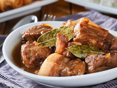 フィリピンの定番家庭料理です。豚肉や鶏肉、牛肉をニンニクや酢、醤油、胡椒と一緒に煮込んで作ります。