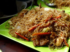 フィリピン風焼きそばです。具材には、チキンやエビ、野菜などをたくさん使い、味付けはパティス(魚醤)、カラマンシーを使います。