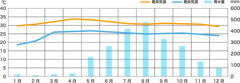 1年間を通じて暖かく、年平均気温は26~27℃です。6~11月が雨期、12~5月が乾期になります。
